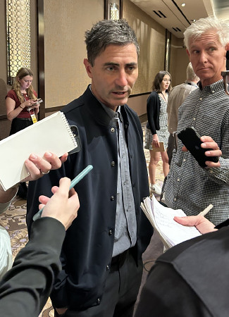 米大リーグのゼネラルマネジャー(GM)会議が11日、ネバダ州ラスベガスで始まり、プロ野球西武からメジャー移籍を目指す今井達也投手ら日本選手が話題になった。写真は、取材に応じるパドレスのプレラーGM。 【時事通信社】