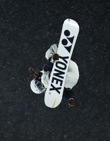 スノーボード女子ハーフパイプ決勝3回目、工藤璃星のエア。5位だった=12日、リビーニョ 【時事通信社】