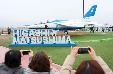 宮城県東松島市の道の駅「東松島」で27日、航空自衛隊松島基地に所属する曲技飛行チーム「ブルーインパルス」の退役機がお披露目された。 【時事通信社】