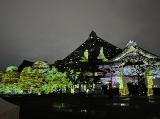 二条城「東南隅櫓(すみやぐら)」(京都市中京区)で3月4日、ウクライナカラーの黄色と青のライトアップが始まった。