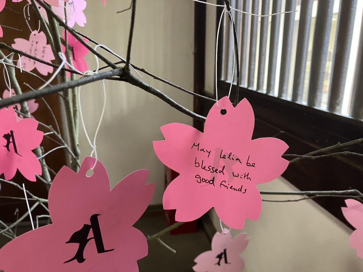 開山・月輪大師800年遠忌を迎えた今年、京都・東山の御寺・泉涌寺(京都市東山区泉涌寺山内町)の楊貴妃観音堂で現在、願いを書いた桜型の紙を枝に結ぶ「願いの桜」が行われている。