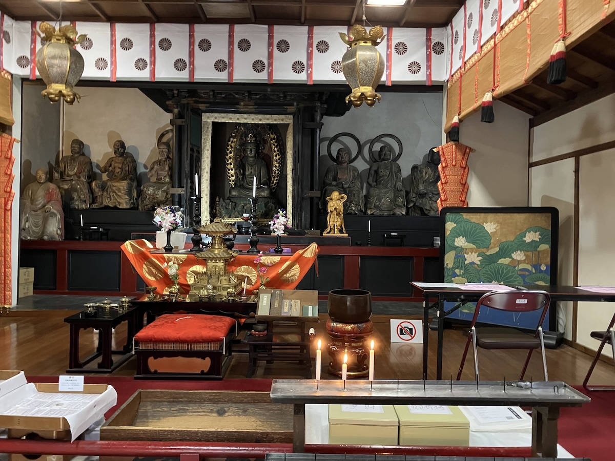 普段は入れない内陣で楊貴妃観音像に見守られながら写経ができる