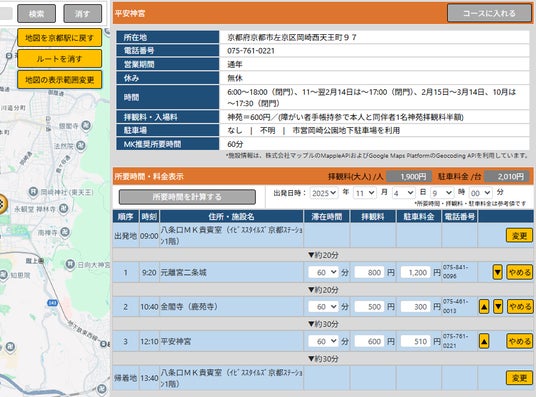 エムケイ株式会社(本社:京都市南区、社長:前川博司、「MK」という)は、2025年11月4日に観光貸切タクシーによる京都観光のコースつくりを自分で作成することができるWEBサービス「京たびプランナー by MKタクシー」をリリースしました。訪問したい観光スポットを画面上のアイコンや検索から選んでいくことで画面上の地図にマッピングされ、スポット間の移動時間も自動で計算されて行程表が作成できます。作った行程でそのまま観光貸切タクシーを予約することも可能です。