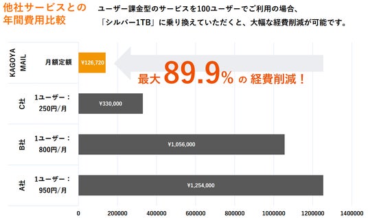 例えば、他社のユーザー課金型メールサービスを100ユーザーでご利用の場合、「シルバー1TB」に乗り換えていただくと、年間で最大89.9%の経費削減効果が見込めます。