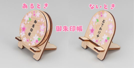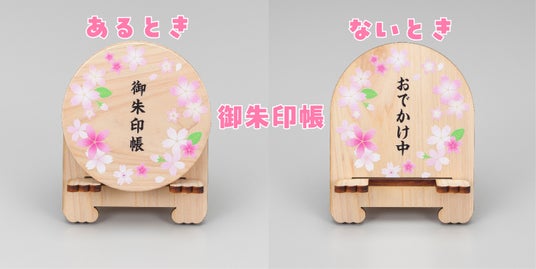 ・「なぜスタンドがセットなのか」ひとえに、丸型は角が無いので机で転がってしまうのです(笑) だったら飾れるスタンドでテーブルに花を添えたい♪とおまけにしました。御朱印帳を取り出すと「おでかけ中」の文字が現れます。スマホスタンドとしても使える仕様です。