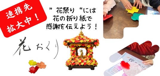 参加者が、折り紙の裏面に大切な人への感謝メッセージを書き、花の形に折って、寺院へ郵送または持参します。集まった折り紙の花は花御堂に飾られ、4月8日の花祭り法要でお釈迦さまにお供えします。法要の様子はYouTubeにてライブ配信予定です(4月8日(水)17時30分開始)。