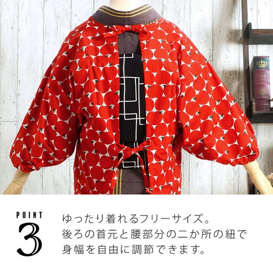 着物の袖もすっぽり収まるたっぷりとした袖は、袖口がゴム仕様になっており、中の服(着物)の袖口をしっかりカバーして汚れを防ぎます。作業の邪魔になりにくい七分丈を採用しました。