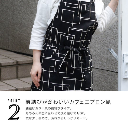 前結びがかわいいカフェエプロン風腰紐はカフェ風の前結びタイプ(後ろ結びでもOK)。丈は少し長めで、汚れからしっかりガードします。