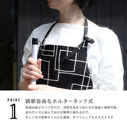 調節自由なホルターネック式首紐は結ぶタイプなので、体型をあまり気にせず自分サイズに自由に調節可能。簡単に着脱できるので忙しい方の家事タイムに最適です。