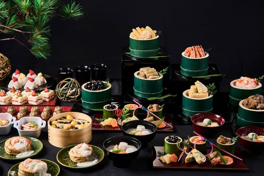 新春を祝う「祝い前菜七福」やお雑煮などお正月のご馳走が勢揃い。ディナーには、本マグロのお刺身やズワイ蟹の大せいろ蒸しも登場!