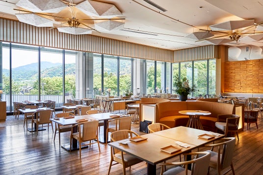 オールデイダイニング「洛空」天井までの一面の窓からは、東山三十六峰に囲まれた京都市内や蹴上インクラインの眺めが楽しめる開放的なブッフェレストラン。