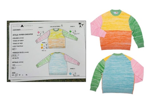 お好きなカラーのヤーンを組み合わせて、紙と色鉛筆で自由にデザイン。ヤーンのカラーはもちろん、パネルの配置や配色も自由に組み合わせながら、〈WASTE YARN PROJECT 〉らしいユニークな糸で編み上げる特別なニットオーダー。 世界に一枚だけのあなただけのニットをお作りいただけます。