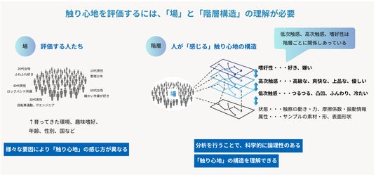 触り心地を評価するには、「場」と「階層構造」の理解が必要。場となる評価する人たちは、様々な要因により「触り心地」の感じ方が異なります。また触り心地の構造である、低次触感、高次触感、嗜好性は、階層ごとに関係しあっています。