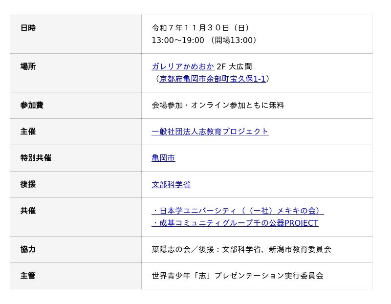 京都府亀岡市(市長:桂川孝裕)は、来る令和7年11月30日(日)、ガレリアかめおかにて、一般社団法人志教育プロジェクトが主催する「第8回 世界青少年「志」プレゼンテーション大会」を西日本で初めて、特別共催として本市で開催します。本市では、主催団体と連携し、過去には市内の児童生徒が参加した「志」のモザイクアートでギネス世界記録(R)を達成するなど、子どもたちの「志」を育む教育プロジェクトを推進してきました。今回の亀岡市での開催は、こうした継続的な取組の一環であり、市内選考を勝ち抜いた代表を含めた熱い志をもつ若者の挑戦を市をあげて応援します。