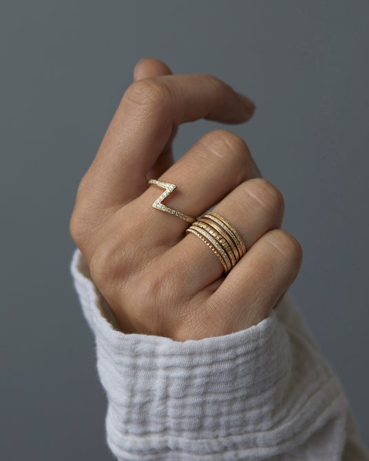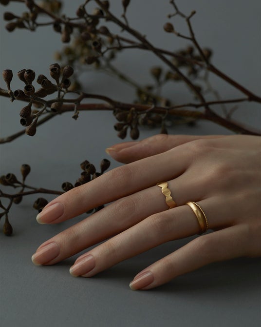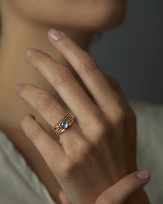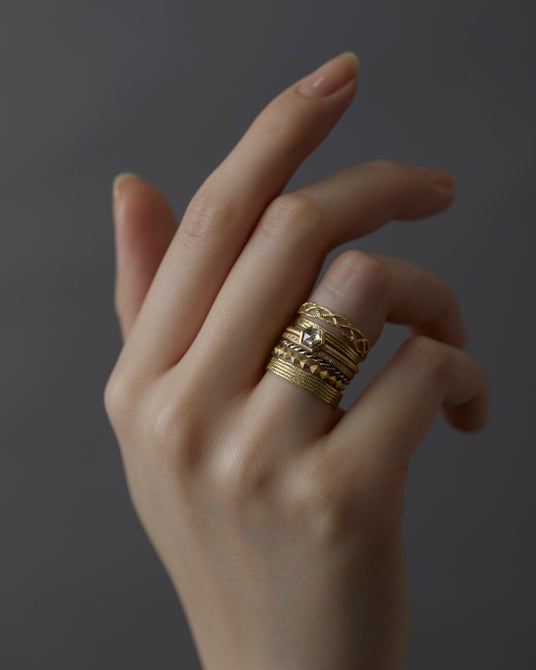 年月を重ねても変わらぬ美しさを放つタイムレスなデザインと、ひとつひとつ手作業で仕上げられるあたたかみのある質感が魅力。スタッキングで自分だけのバランスを楽しめるリングやブライダルジュエリーも並びます。
