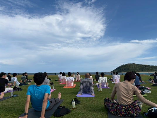 緑豊かな芝生の上で行われたヨガ体験では、講師の丁寧な指導のもと、参加者の皆さんが日々の疲れと向き合いながら心身を解きほぐしました。ほとんどがヨガ未経験者でしたが、それぞれが自分にとって心地よいポーズを見つけ、穏やかな時間を満喫。目の前には青い海、真上には澄み渡る空が広がり、自然と一体になるような贅沢なひとときに。