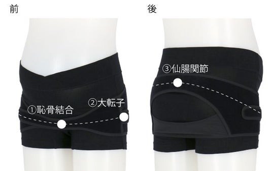 骨盤まわりの3つのポイント(仙腸関節~大転子~恥骨結合)を環状にサポートし、仕事や育児などで動いてもズレにくい設計です。