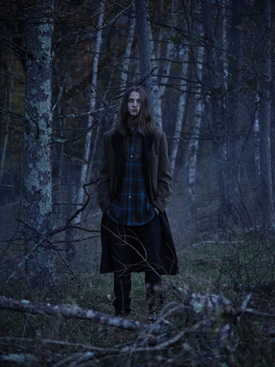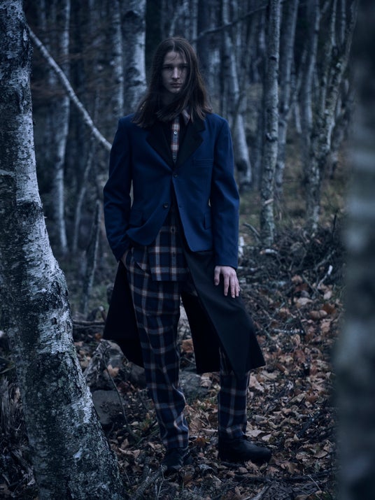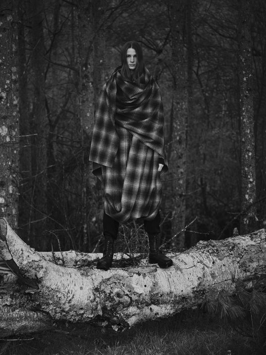 本コレクションでは、Yohji Yamamoto POUR HOMME 2008?09AWランウェイに登場したチェック柄アイテムを再構築し、ジャケット、シャツ、パンツを展開します。ブランケットのように贅沢にチェック生地を用いた分量感のあるストールジャケットや、レイヤード構造のジャケット、プリーツ部分にチェック生地を縫い込んだジャケットなど、ロング丈のジャケットに細身シルエットのパンツを組み合わせています。希少なUSメイドのペンドルトンチェック生地のオーセンティックで温かみのある表情を、ヨウジヤマモトならではのシルエットやデザインと組み合わせ、新たなスタイルとして提示します。