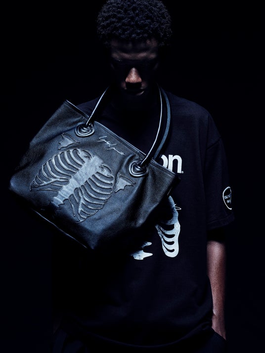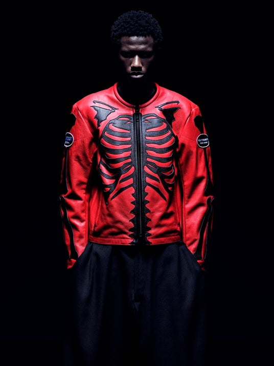 本コレクションでは、VANSONのクラシックなプロダクトをベースに、BONEデザインをYohji Yamamoto POUR HOMMEの視点から再構築したジャケット、バッグ、グローブを展開します。ジャケットはシングルライダースに立体的な骨モチーフのダブルレザーパネルを配置。カラーレスデザイン、フロントジップ、バックル、外ポケット、スリーブ肩位置のオーバルワッペンなどVANSON伝統の仕様を採用しています。BONE柄のトートバッグは、ハンドルの長さを調整し、フロント・バックパネルやレザーパッチの配置を変更した特別仕様。いずれのモデルにもBONEグラフィックとYohji Yamamotoのネームを施しています。ジャケットをご購入いただいた方には、限定ノベルティーとして、BONE TEE SHIRTをご用意しています。