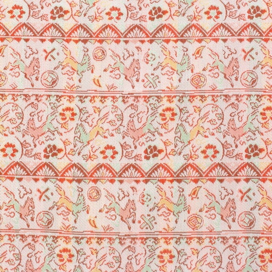 中国陶磁器の一種で白磁に下絵を赤、緑、黄、青、黒の釉薬で描いたものは赤絵と呼ばれ、遠くヨーロッパの陶芸にも大きな影響を与えるほどのものでした。その最盛期で色鮮やかな作品が数多く作られるようになった中国・明時代の作品の中から軽やかに駆ける馬の意匠に範を求め、七宝や丁子、宝巻などの宝尽くしと富貴の象徴として愛された牡丹唐草を組み合わせました。リズミカルに駆け抜ける馬を描く絵付けの伸びやかな筆使いや明時代の赤絵が持つ華やかな趣を経錦の織り技法で表現しました。
