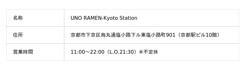 京都駅ビル開発株式会社(京都市下京区、代表取締役社? 橋本 修男)が管理する京都駅ビル10階京都拉麺小路に、株式会社プラントベースドフード(京都市東山区、代表取締役 鵜野 友紀子)が、京都祇園に本店を構える「ぎをん豆乳ら~めん うのゆきこ」が「UNO RAMEN -Kyoto Station-」として2025年12月21日(日)に新規オープンいたします。