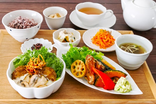 えらべるメインのおかずと、副菜やごはん、みそ汁などがセットになった人気のランチメニューも、冬メニューにリニューアル。メインのおかずには、人気の「揚げ鶏のねぎソース」に加え、きのこたっぷりの濃厚クリームソースに、ごぼうチップでアクセントを加えた「ハンバーグ きのこクリームソース」、高知県産のサバを使用し、まろやかなアボカド豆腐ソースで仕上げた「サバの竜田揚げ アボカド豆腐ソース」が登場します。