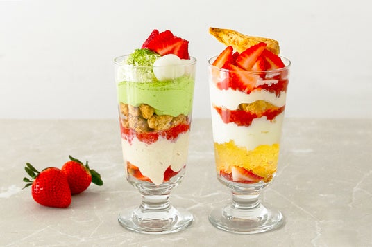 たっぷりのいちごと白玉を合わせた和風パフェ「いちごと白ごまのパフェ」は、濃厚な白ごまプリンにストロベリーソースと抹茶クリームを重ね、白ごまクランブルで食感をプラスしました。「いちごのミルフィーユパフェ」は、甘酸っぱいいちごにカスタードクリームとシュガーパイを重ね、ミルフィーユのように仕上げた贅沢な一品。