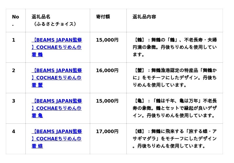 本返礼品は、京都府北部・丹後地域特有の「丹後ちりめん」を使用し、「鶴」「蟹」「亀」「蝶」といった舞鶴をモチーフにした、「ビームス ジャパン 舞鶴」の店頭と舞鶴市ふるさと納税でのみ販売されている限定品です。現時点でWEB上では「ふるさとチョイス」のみで申し込みが可能です。