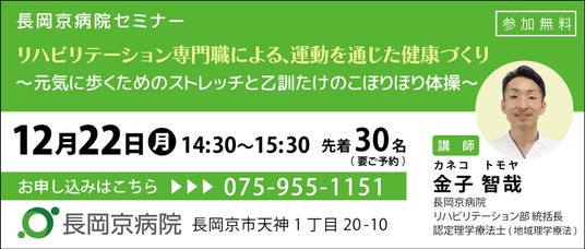 株式会社セントラルメディエンス(本社:東京都港区、代表取締役:中川隆太郎、以下「当社」)の提携医療機関である、医療法人総心会 長岡京病院 (所在地:京都府長岡京市、理事長:水黒知行、以下「当院」)は、12月22日(月)に運動やストレッチに関するセミナーを開催することをお知らせいたします。