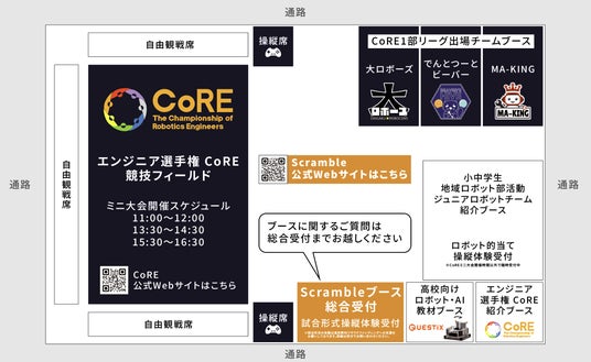 次世代ロボットエンジニア支援機構が主催する全世代向けのエンジニア育成の場、エンジニア選手権、通称CoRE(コア)のミニ大会を実施します!競技フィールドは2部リーグと同様のサイズを用意。12m×8mのフィールド上で繰り広げられる2vs2のロボットバトルをお見逃しなく!