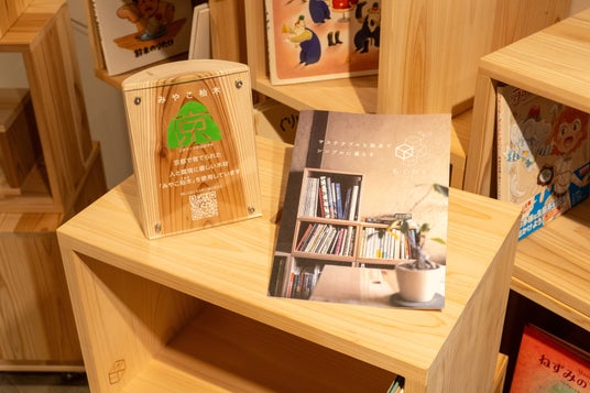 本をつなぐ本棚は「sumao すまいの雑貨店(京都市中京区)」の「もくわく(R)?」を使用しています。「もくわく(R)?」は、「森と暮らしを環る」をコンセプトに、生活の中に気軽に木を取り入れながら、使い捨ての家具を減らす提案をしています。日本の森を守ることに賛同する各地の製材所で作られており「木の地産地消」を推進しています。