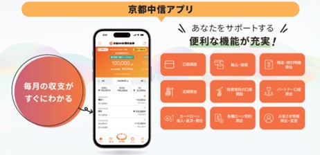 「京都中信アプリ」は、窓口へ来店することなく、「口座開設」や「振込・振替」、「残高照会・入出金明細」などの便利な機能であなたをサポート。自宅でも外出先でも、スマホで気軽に利用できます!
