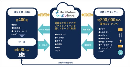 リロクラブが提供する“クーポンBank”は、リロクラブに加盟しているクーポンを、各企業がアプリやWebサービスの稼働促進や顧客ニーズに応じて選ぶことができ、最適な形で提供できるサービスです。