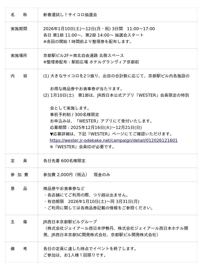 JR西日本京都駅ビルグループ(株式会社ジェイアール西日本伊勢丹、株式会社ジェイアール西日本ホテル開発、JR西日本京都SC開発株式会社、京都駅ビル開発株式会社)は、お客様への感謝の気持ちを込めて、空くじなしのお得な抽選会を開催します。