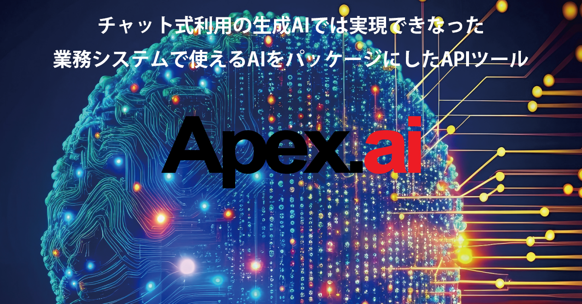 既存業務システムをAI化するAPIツール 「Apex.ai」は、 従来のRAGに代表されるような文書やテキストを投入して生成AIに理解させるアプローチとは異なり、数値と項目といった組み合わせ情報をベクトルデータベースを用いて自然文として取り出すことができる、せるようにしたApex.aiは、業務アプリケーションや基幹システムとの組み合わせに特化した独自機能を提供する生成AIとAIエージェントののハイブリッドなAPIツール製品です。各企業が利用する業務アプリケーションや基幹システムに長年蓄積されているデータを生成AIを用いて取り出し、意味付けするために必要なフォーマット作業をApex.aiを用いて簡単に行うことが出来ます。