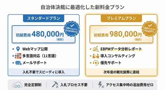 - プレミアムプラン(初期費用980,000円): 100万円以下の随契に対応。詳細なEBPMデータ分析レポートを提供し、次年度の観光施策に直結させます。