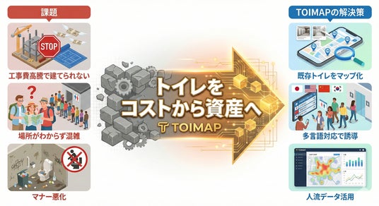 現在、多くの観光地がオーバーツーリズムによる「トイレ不足・混雑」と「マナー問題」に直面しています。しかし、工事費高騰により新たな公衆トイレを建設することは困難です。 TOIMAPは、既存の「まちのトイレ」をデジタルで繋ぎ、11言語対応・設備検索・マナー啓発を行うことで、「新しいトイレを建てずに、今あるトイレを資産に変える」解決策を提供します。