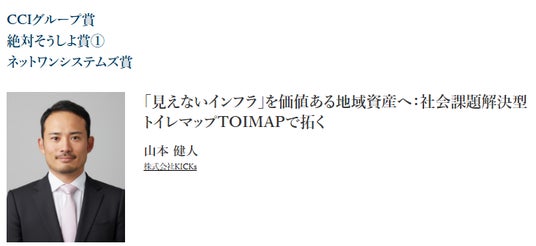 株式会社KICKs(本社:京都市下京区、代表取締役:山本健人)が提供する、観光地トイレ情報DXサービス「TOIMAP(トイマップ)」は、2025年12月15日に開催された「MITANI Business Contest 2025」において、ファイナリストに選出。核融合やAI医療など最先端技術が並ぶ中、「身近な環境からのDX」として、以下の3つの企業賞を同時受賞いたしました。