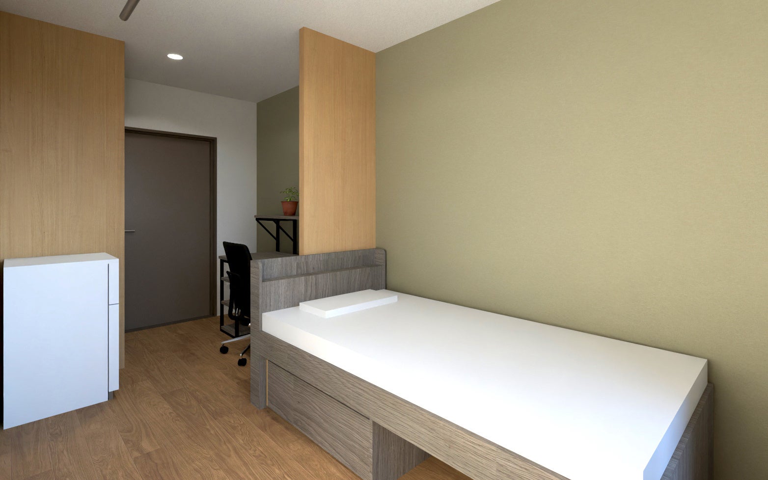 本寮は、立命館宇治中学校・高等学校の敷地内に位置し、校舎まで徒歩約3分という絶好のロケーションに誕生します。「生徒がともに生活し、学び合い、成長する教育寮」をコンセプトに、単なる住居としての機能を超え、寮生同士が刺激し合いながら成長できる環境を目指しました。プライバシーに配慮した居室を確保しつつ、RA(レジデント・アシスタント)プログラム(※)や多様な共用空間を導入することで、「仲間とのつながり」と「個人の時間」を両立。初めて集団で生活される生徒様が安心して、充実した学校生活をスタートできる住環境を提供いたします。