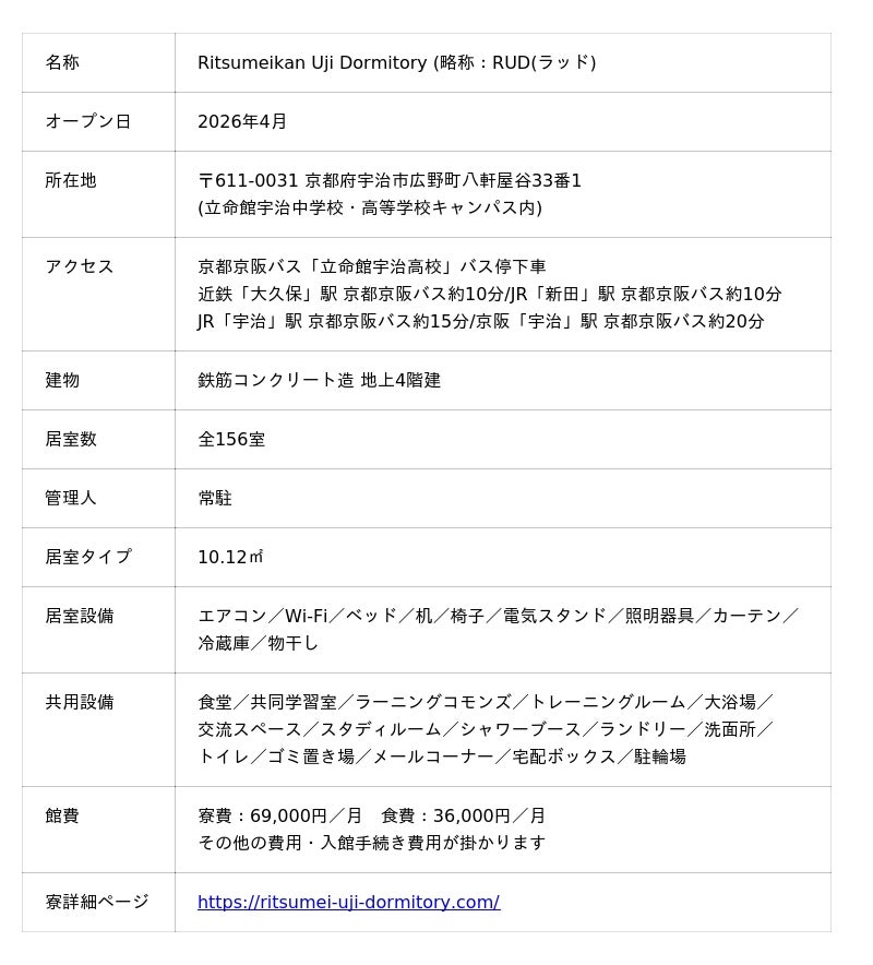 「Ritsumeikan Uji Dormitory」公式WEBサイト:https://ritsumei-uji-dormitory.com/