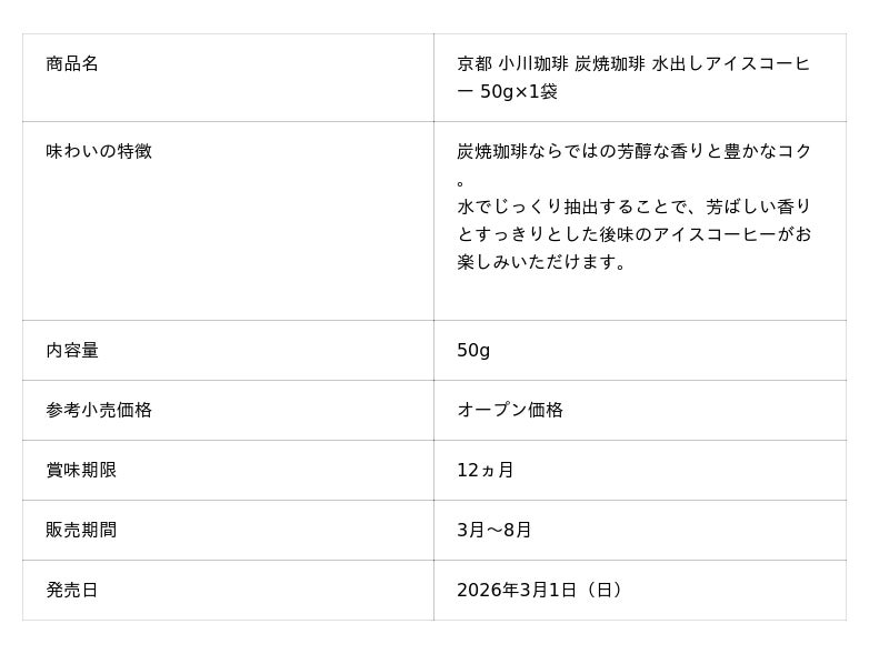 小川珈琲株式会社(本社:京都市右京区、代表取締役社長/CEO:宇田 吉範)は、家庭用商品として展開する「京都 小川珈琲 炭焼珈琲シリーズ」より「京都 小川珈琲 炭焼珈琲 アイスコーヒー 粉140g」と「京都 小川珈琲 炭焼珈琲 水出しアイスコーヒー 50g×1袋」を2026年3月1日(日)より発売します。