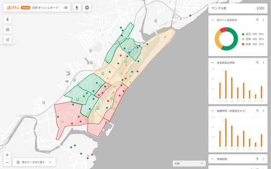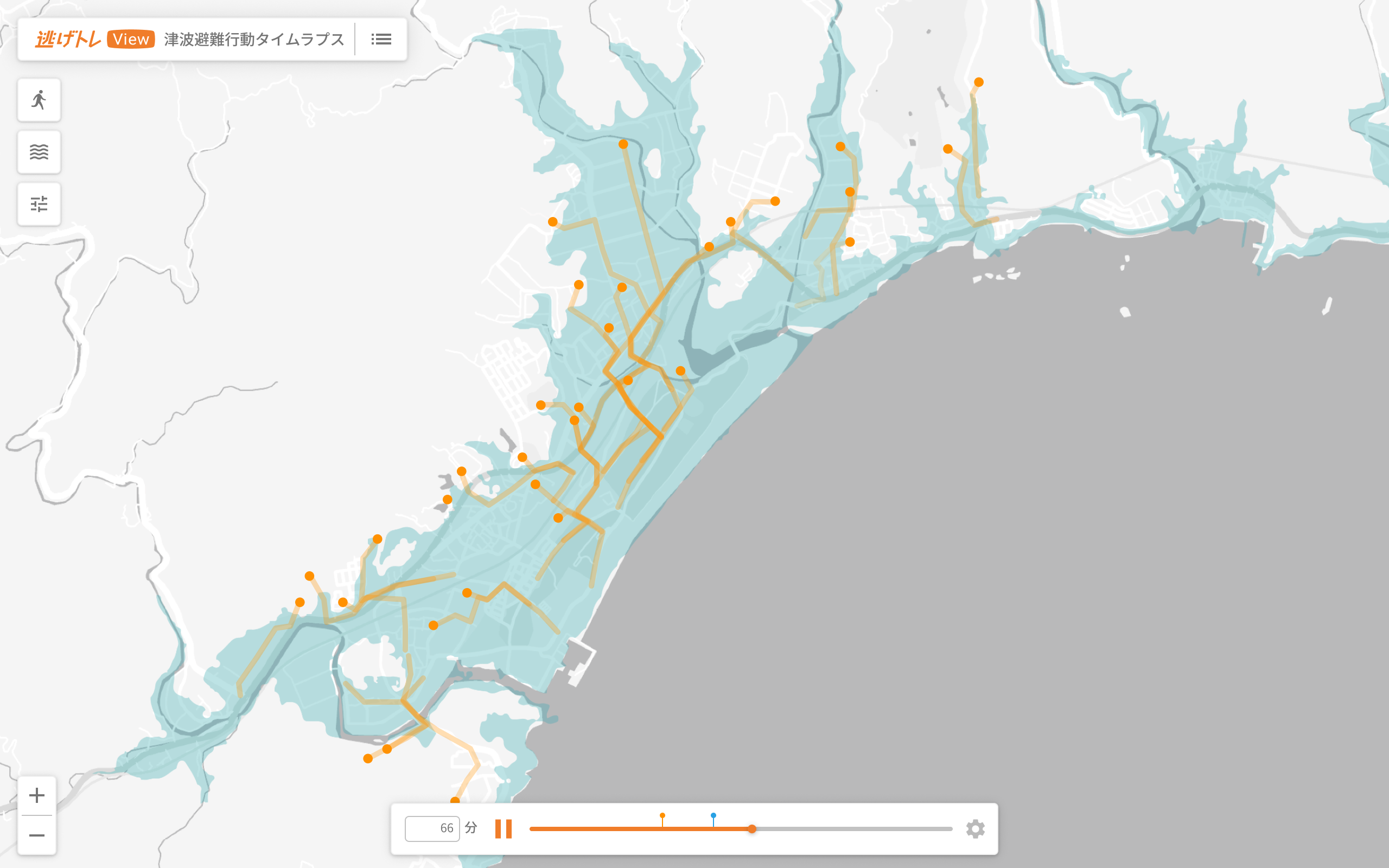「逃げトレView」は、スマートフォン用アプリ「逃げトレ」を使った個別津波避難訓練のログデータを集積・可視化し、分析するためのWebアプリケーションです。防災に関わる自治体職員などを対象に、集積されたデータをマップや各種チャートで確認することで、訓練をおこなった個人のみならず、団体・組織、地域全体にとっての津波避難戦略をより実用的に検討できるように支援します。