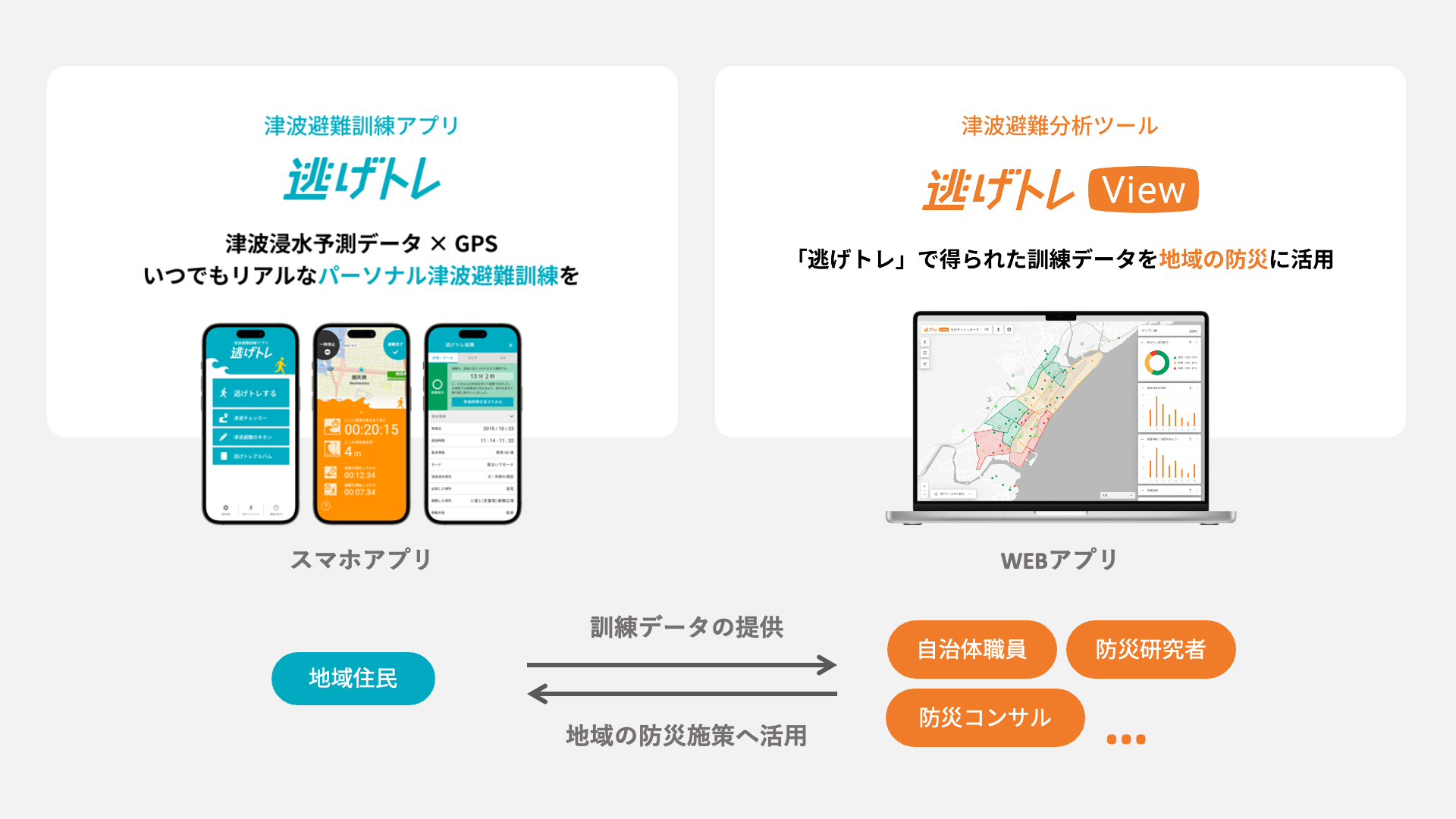 「逃げトレView」のデータは、スマートフォンアプリ「逃げトレ」を通じて取得されます。本アプリは、GPS情報と津波の浸水想定をもとに、誰もがいつでもリアルな津波避難訓練を行える仕組みです。地域住民など個人が繰り返し訓練を行うことで、避難行動を見直し、改善できると同時に、「逃げトレView」によって個々人の訓練データが蓄積されることで、行政や地域は避難行動の様子を把握し、地域全体の避難戦略の検討精度を高めることが可能になります。