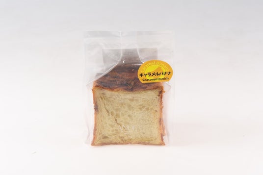 内容: バナナの風味豊かなデニッシュの中にキャラメルチョコを散りばめました。バナナとキャラメルの2つの甘さがマッチしたデニッシュです。