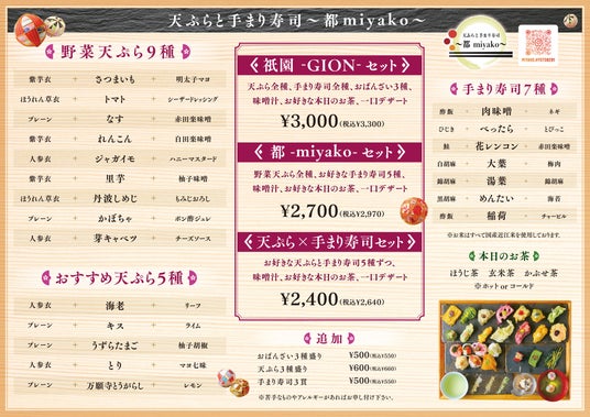 「天ぷらと手まり寿司 都~miyako~」は、四季折々の素材を活かした天ぷらと、彩り豊かな手まり寿司を中心に、京都ならではの趣と華やかさを感じていただける和食体験をご提供。移転を機に、これまで以上に満足度の高いひとときをお届けできる店舗として新たにスタートいたしました。