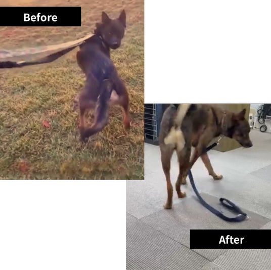 両足パテラ発症により、後ろ足が常に開いたような状態に。歩行が困難になったものの、施術後は足が真っ直ぐに矯正され、再び元気に散歩を楽しめるようになりました。