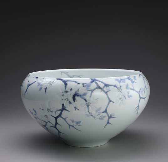 ↑【日本伝統工芸近畿賞】 染付彫鉢「枳殼」(そめつけほりばち「からたち」) 本多 亜弥