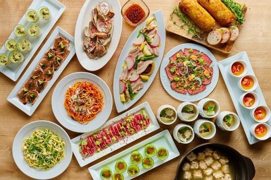 ご家族やご友人皆さまでのお集まりに最適な、バラエティ豊かなお料理をランチ・ディナーともに食べ放題でお楽しみいただけます。出来立てをご提供するライブキッチンメニューとして、ランチタイムには「ブラックお好み焼き フォアグラ添え」と「串カツ3種」を、ディナータイムには「牛ロース肉の鉄板焼」をご堪能ください。その他、「新ジャガイモのブランマンジェ クレソンのクレメ」や「鰆のカルパッチョ バジル風味」など季節の食材を使用したホテルシェフおすすめのお料理も種類豊富に取り揃えます。さらに、「オムライス」や「煮込みハンバーグ」といったキッズメニューに加え、デザートには焼き立てクレープを自由にアレンジできるコーナーやチョコレートファウンテンもあり、大人からお子様まで幅広くお楽しみいただけます。