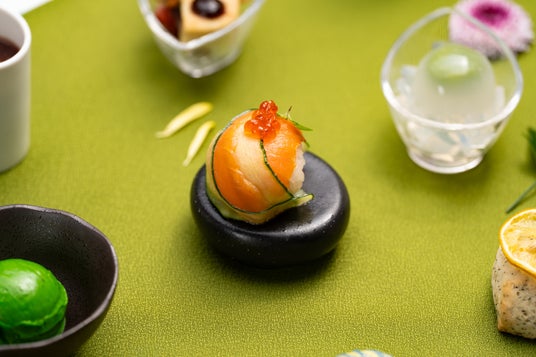 【鮭の一口手毬寿司】 ほどよく脂ののった鮭を使った、可愛らしい一口サイズの手毬寿司。きゅうりのさわやかな後味と共に、軽やかな口当たりで、ティータイムにも楽しめる和のアクセントです。