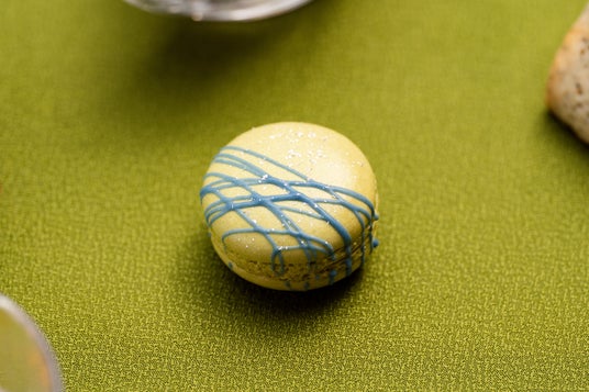 【新緑香る 抹茶マカロン】 夏の竹林を思わせる青の模様と吹き抜ける風をイメージした銀紛が見た目にも涼しい抹茶のほろ苦さとやさしい甘みが調和したマカロン。新緑を思わせる鮮やかな色合いと、軽やかな口どけが印象的です。